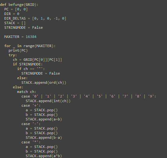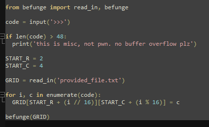befunge.py looks to be an interpreter for the esolang Befunge . Chall.py gives us the abilty to write to the 3x16 grid enclosed by "#" in 'provided_file.txt'. Looks like the '#' character is a springboard though, moving us multiple tiles.