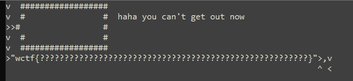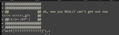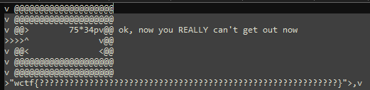 The 'p' opcode has been disabled; that's alright though; we can use the 'g' opcode to read the contents of the grid at an arbitrary point. The below program loops and increments a value in the stack, printing out that column of row 7. Once it hits column 27, the '|' operator at the end of the bottom line will cause the pointer to go down rather than up, hitting a wall and ending the program (this is actually useless in this case though, as an infinite loop would have extracted the flag just as well.)