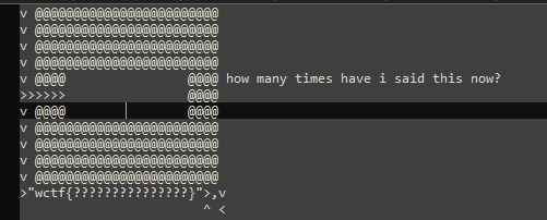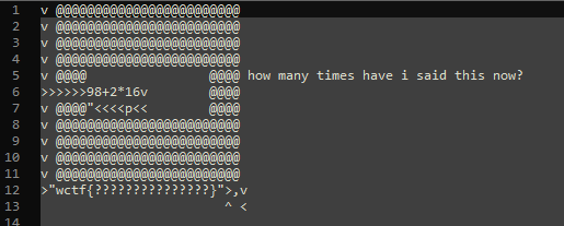 Now the walls actually can't just be walked through; we're going to have to make use of the 'p' opcode, which takes the last 3 values off the stack and write a new character to the grid of instructions; the below program writes a springboard to the location where the inner wall should be, letting us jump over it and grab the flag.